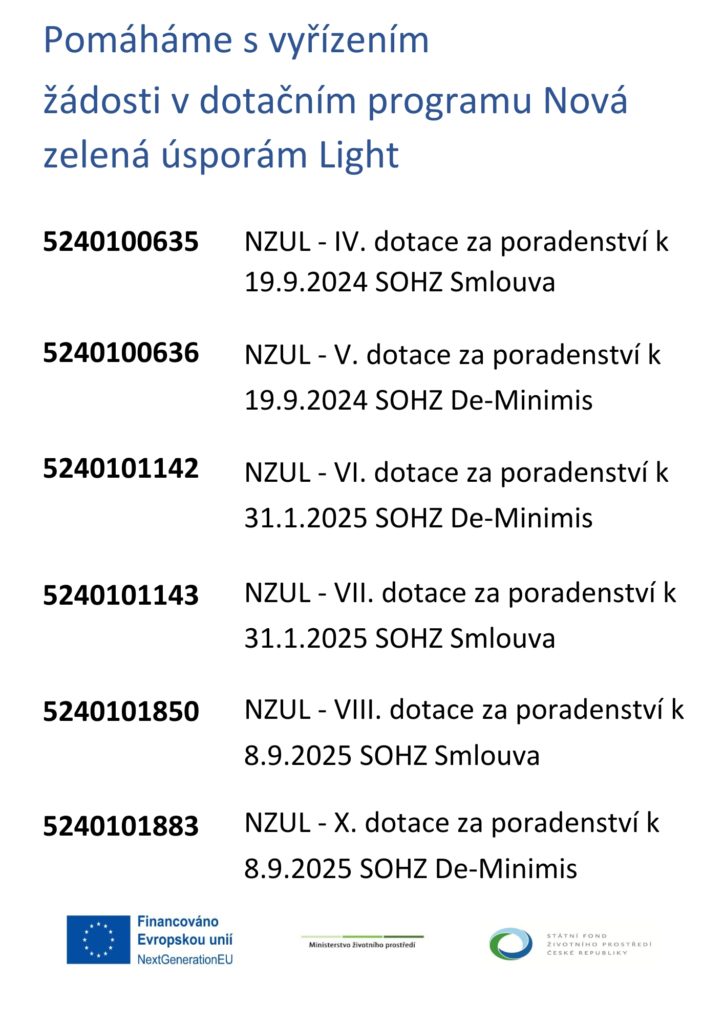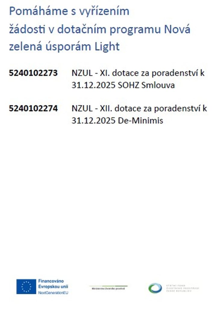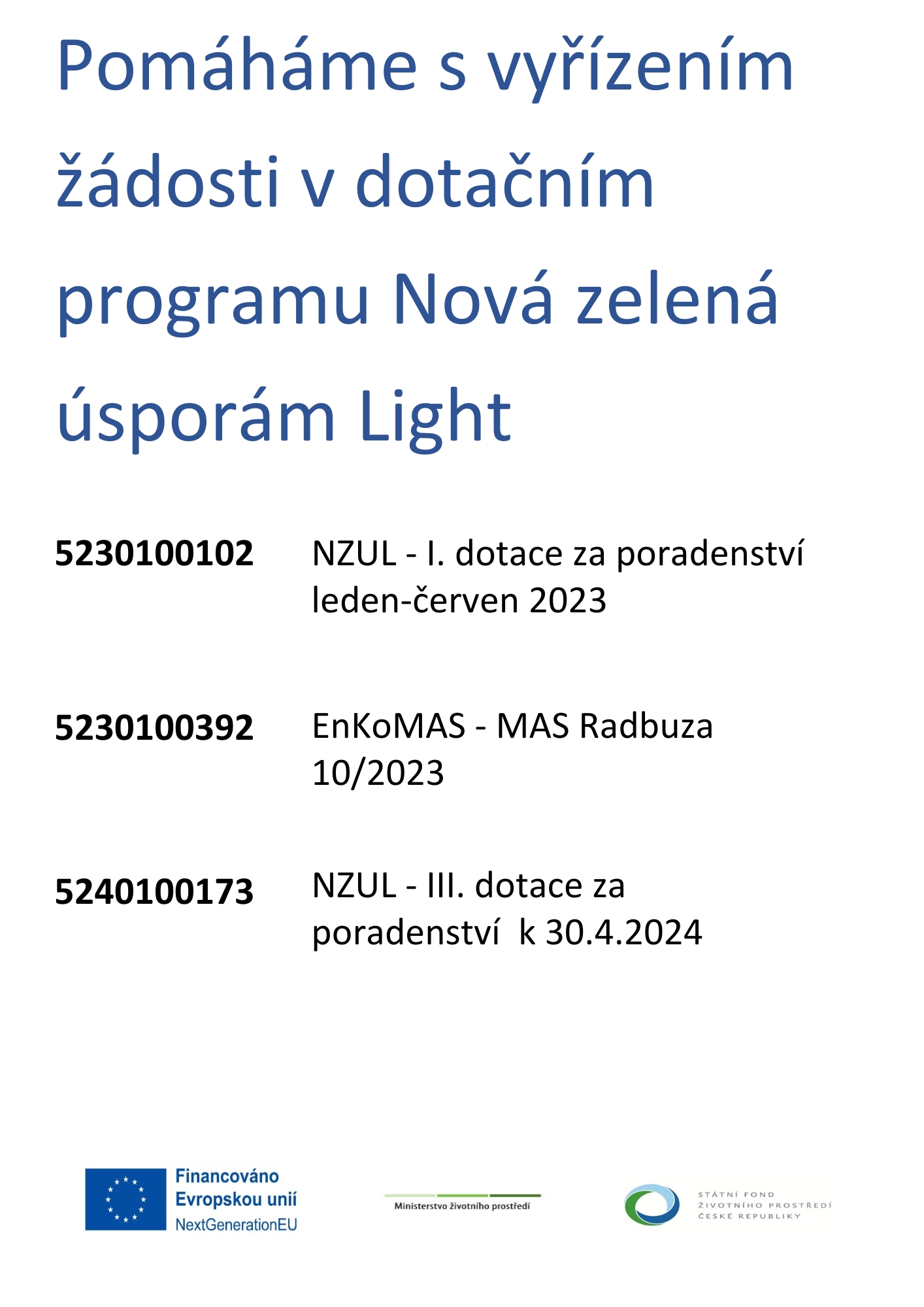 MAS Radbuza poskytovala poradenství a asistenci při podávání žádostí domácnostem v rámci dotačního titulu Nová Zelená úsporám Light. Službu poskytovala komplexně a na klíč, tj. od založení identity občana, přes zaregistrování do systému AIS SFŽP, vypracování odborného posudku, fotodokumentace, podání žádosti a po celou dobu života projektu i její administrace a na závěr opět fotodokumentaci, vypracování závěrečné zprávy a uzavření žádosti. V průběhu roku 2025 došlo ke zpřísnění pravidel a k rozšíření kontrolních mechanismů, které proces hodnocení žádosti administrativně zkomplikoval.