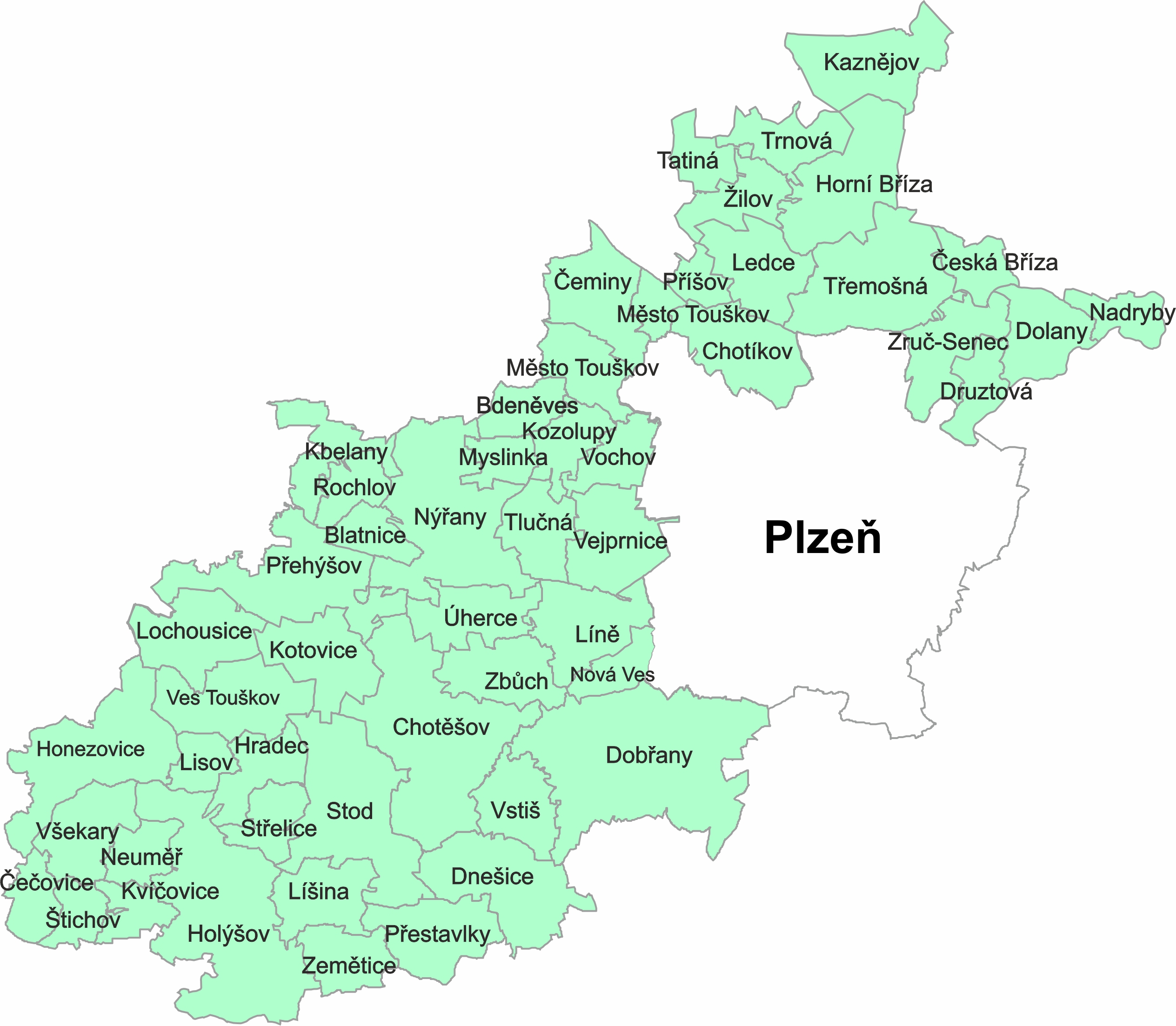 Bdeněves, Blatnice, Čečovice, Čeminy, Česká Bříza, Dnešice, Dobřany, Dolany, Druztová, Holýšov, Honezovice, Horní Bříza, Hradec, Chotěšov, Chotíkov, Kaznějov, Kbelany, Kotovice, Kozolupy, Kvíčovice, Ledce, Líně, Lisov, Líšina, Lochousice, Město Touškov, Myslinka, Nadryby, Neuměř, Nová Ves, Nýřany, Přehýšov, Přestavlky, Příšov, Rochlov, Stod, Střelice, Štichov, Tatiná, Tlučná, Trnová, Třemošná, Úherce, Vejprnice, Ves Touškov, Vochov, Vstiš, Všekary, Zbůch, Zemětice, Zruč-Senec, Žilov